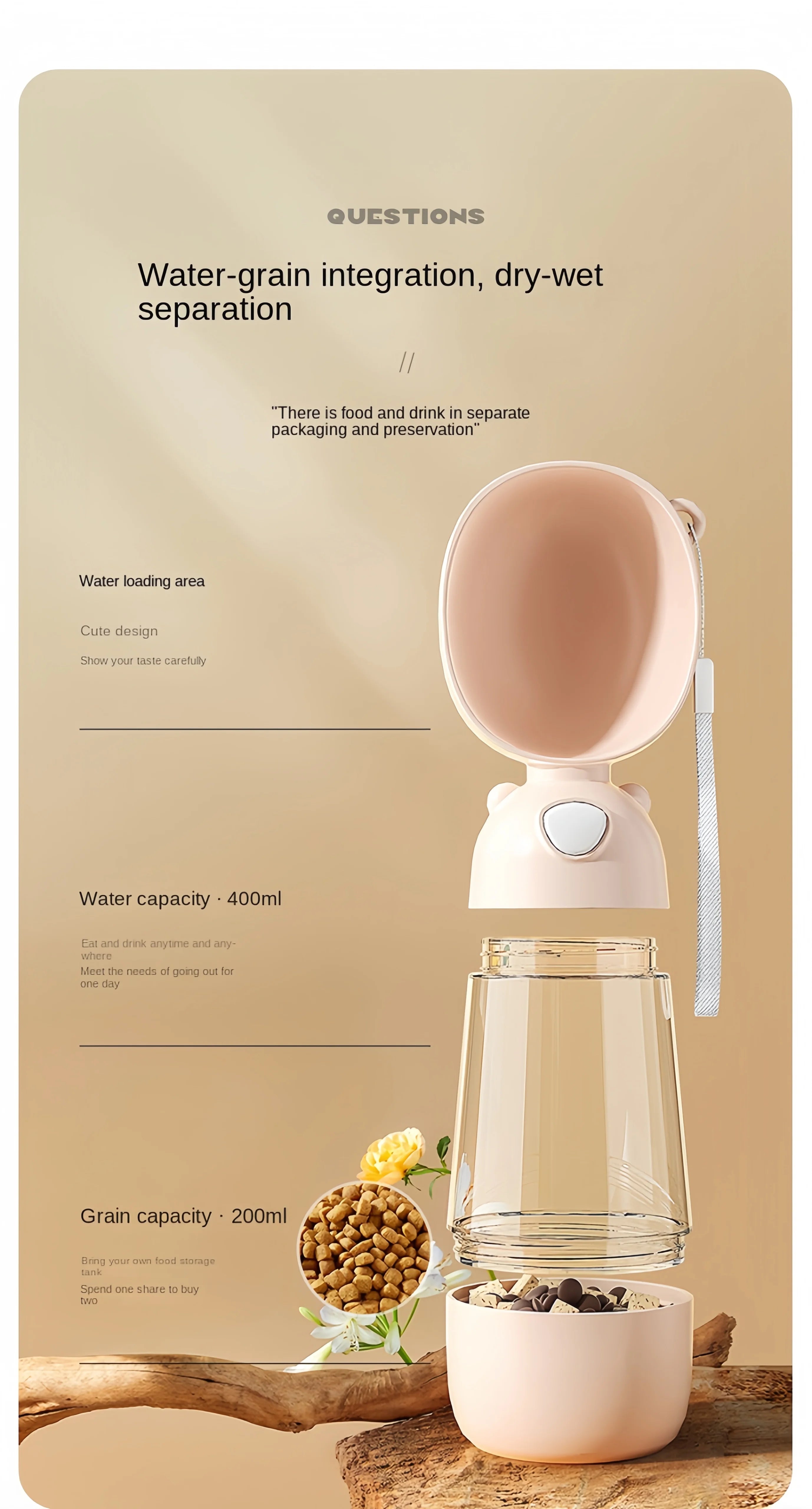Make travel with your furry friend easier than ever with this innovative Portable Water and Food Bottle Bowl! Designed for trips, walks, hikes, or any adventure, this 2-in-1 bottle ensures your pet stays hydrated and fed on the go. With its sleek and compact design, you can conveniently carry both water and food in one handy bottle, making it the perfect solution for travel-loving pet owners.